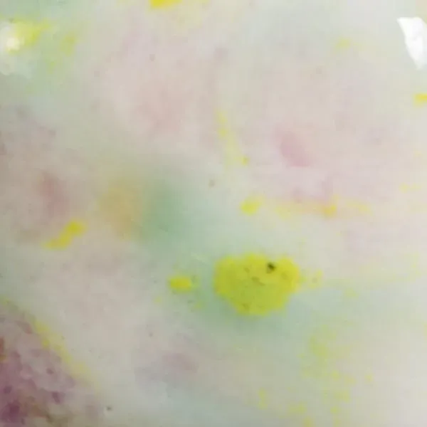 Jazz Notes is een ondoorzichtig wit basisglazuur met blauwgroene, gele en paarse kristallen.