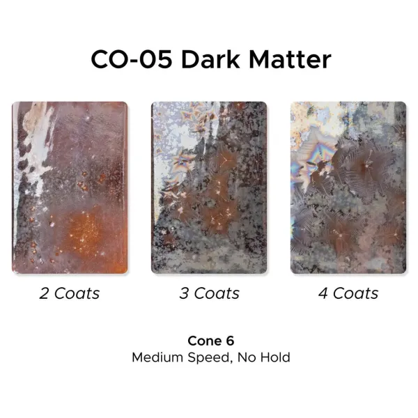 CO-3 Event Horizon is een donker, vloeibaar glazuur dat bij cone 5 varieert tussen grote kristallen met blauwe en violette accenten en bij cone 6 een heldergouden oppervlak vertoont.