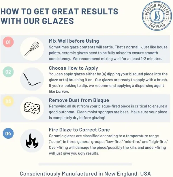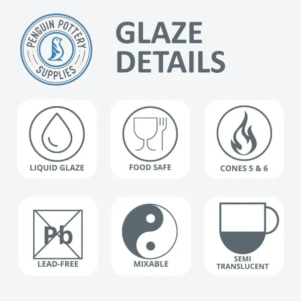De glazuren van Penguin Pottery bieden een enorm scala aan effecten om uit te kiezen: levendig, helder, glad, glanzend, gestructureerd, satijnachtig, mat; ondoorzichtig, halfdoorzichtig, halfdoorzichtig, doorzichtig, vloeibaar, niet-vloeibaar. De Low fire glazuren zijn perfect voor schoolprojecten, klaslokalen, ateliers en pottenbakkers die niet op hoge temperatuur bakken. Deze Low fire glazuren zijn de keuze van pottenbakkers die op zoek zijn naar een breed kleurenpalet, zoals celadon, levendig rood, diepgroen en helderblauw. De Midfire glazuren bieden vergelijkbare mogelijkheden, maar introduceren ook interessante effecten en tonaliteiten die niet beschikbaar zijn in laagbrandglazuren. De glazuren zijn loodvrij, niet giftig en voedselveilig (mits op de juiste wijze gebakken en getest). Schud de pot goed voor gebruik en laat deze niet bevriezen.