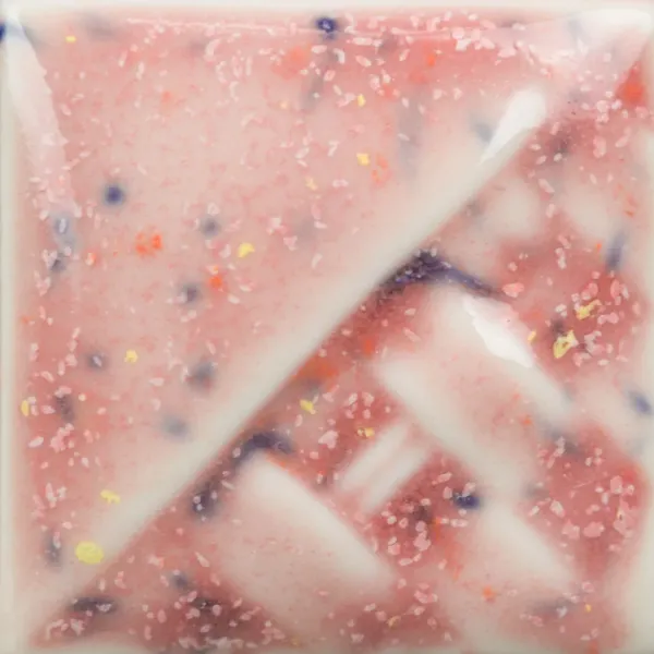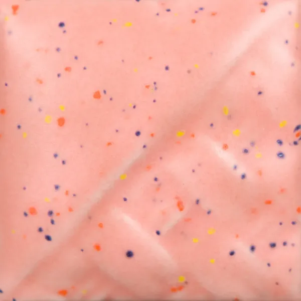 Cone 6: Pink Speck is een satijnmat, halfdekkend lichtroze glazuur dat op textuur breekt. Bevat kleine paarse, oranje en gele spikkels. Stabiel glazuur.